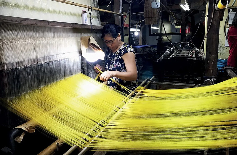 - Dệt lụa: Những sợi tơ đã được se thành chỉ được đưa vào khung cửi để dệt. Quá trình này yêu cầu sự phối hợp nhịp nhàng giữa tay và chân tạo nên dải lụa đều, mịn và chắc.