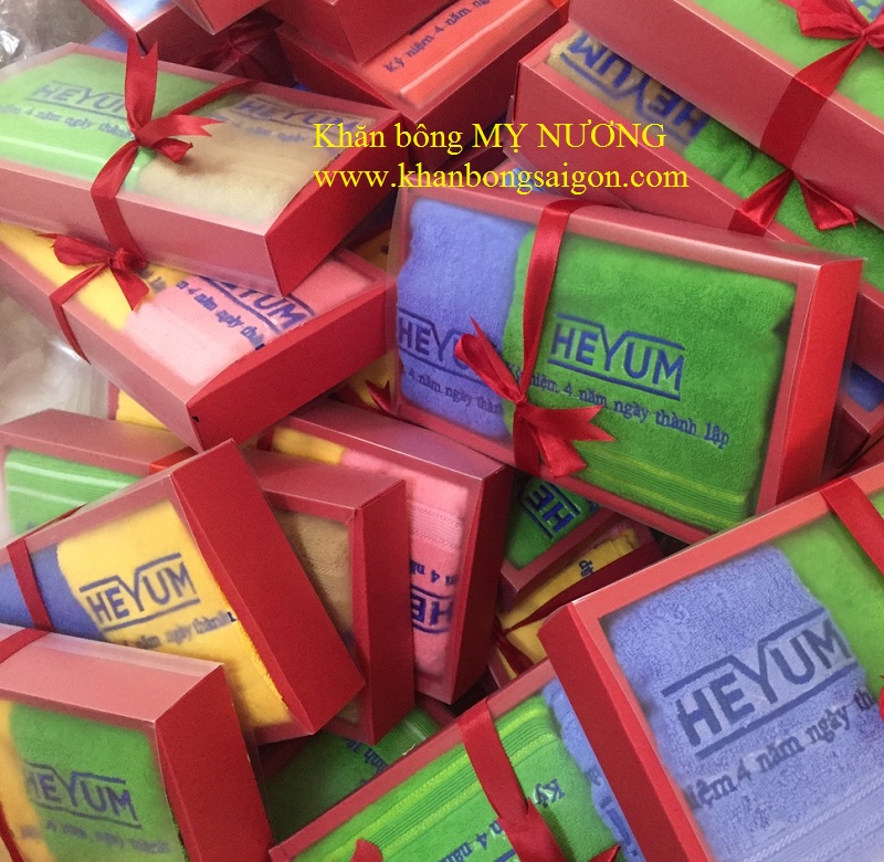 - Khăn quà tặng: Nhận sản xuất Khăn quà tặng theo yêu cầu của khách hàng (In logo, thêu Logo hoặc dệt logo). Khăn quà tặng đựng trong các loại bao bì sang trọng như: Hộp giấy caston; hộp bìa cứng; túi nilon... được buộc và thắt nơ sang trọng, đẹp mắt.