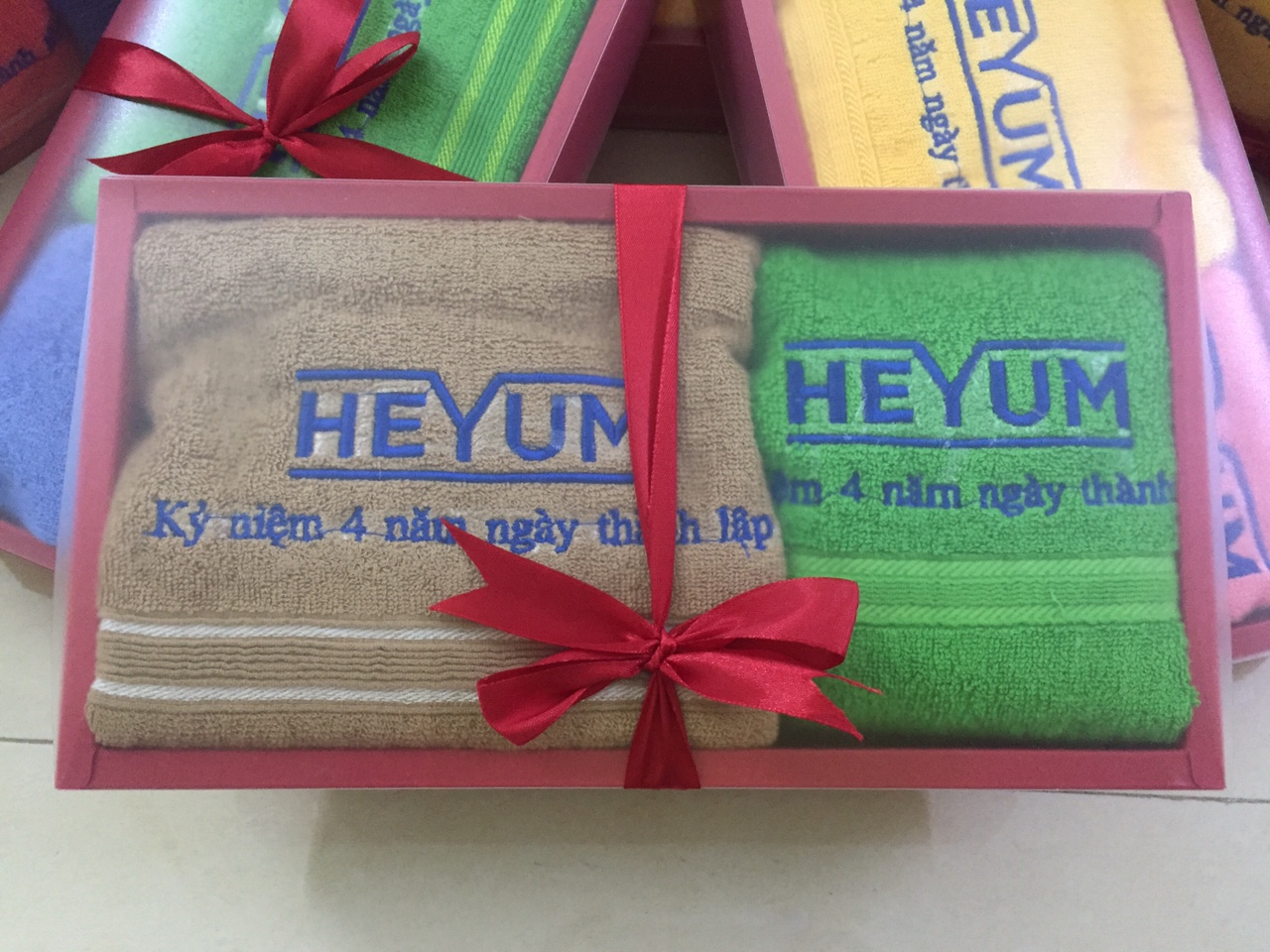 - Khăn quà tặng: Nhận sản xuất Khăn quà tặng theo yêu cầu của khách hàng (In logo, thêu Logo hoặc dệt logo). Khăn quà tặng đựng trong các loại bao bì sang trọng như: Hộp giấy caston; hộp bìa cứng; túi nilon... được buộc và thắt nơ sang trọng, đẹp mắt.