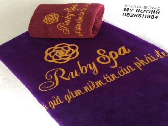 Ảnh: Khăn trải giường Spa màu tim thêu logo