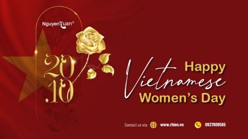 - Bố cục: Nền đỏ đậm tạo cảm giác nổi bật. Hoa hồng vàng cách điệu làm điểm nhấn. Chữ “20.10” thiết kế nghệ thuật, đi kèm dòng “Happy Vietnamese Women’s Day” nổi bật với font hiện đại. Logo thương hiệu đặt ở góc trên.