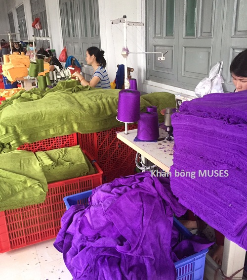 Khăn sau khi được cắt theo kích thước sẽ được Công nhân đưa lên các máy May chuyên dụng để Máy đường viền, đảm bảo chắc chắn và bền cho việc sử dụng sau này.