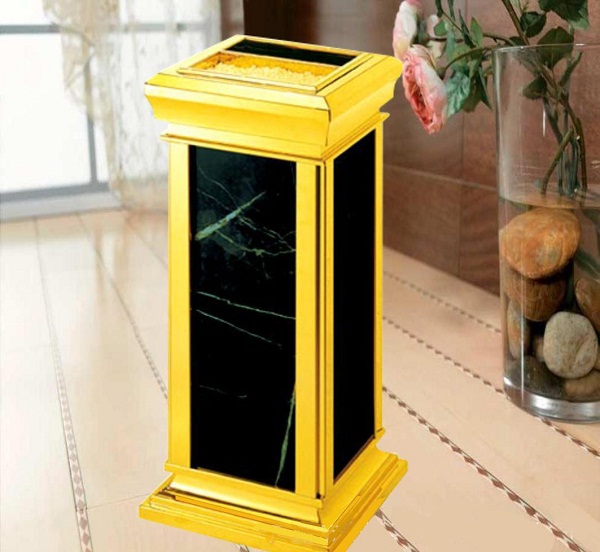 Đây là loại thùng rác được rất nhiều khách hàng lựa chon với chất liệu chính là Inox mạ vàng và đá hoa cương rất đẳng cấp và sang trọng và độ bền rất cao, thiết kế thường có hạng hình lục giác hoặc hình trụ, kích cỡ nhỏ gọn dễ dàng đặt được ở nhiều vị trí phù hợp khác nhau như cạch thang máy, cửa ra vào. với nhiều mầu sắc khác nhau để bạn có thể lựa chọn phừ hợp vơi không gian và kiến trúc của khách sạn.