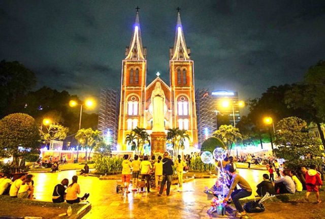 Nhà thờ Đức Bà là một trong những địa điểm vui chơi rất quen thuộc tại Sài Gòn. Điểm đến tọa lạc tại một vị trí giữa trung tâm thành phố với hàng loạt địa điểm vui chơi hấp dẫn xung quanh. Không khí mùa Giáng sinh an lành mỗi năm luôn tràn ngập các con phố và tất cả mọi người đều náo nức đổ về đây vui chơi rất nhộn nhịp. Là một trong những địa điểm đi chơi Giáng sinh tuyệt vời nhất, nhà thờ lớn Đức Bà được trang trí vô cùng lộng lẫy bởi hàng nghìn ánh đèn nhấp nháy đủ màu sắc rực rỡ khiến cho không khí nơi đây trở nên ấm áp hơn.