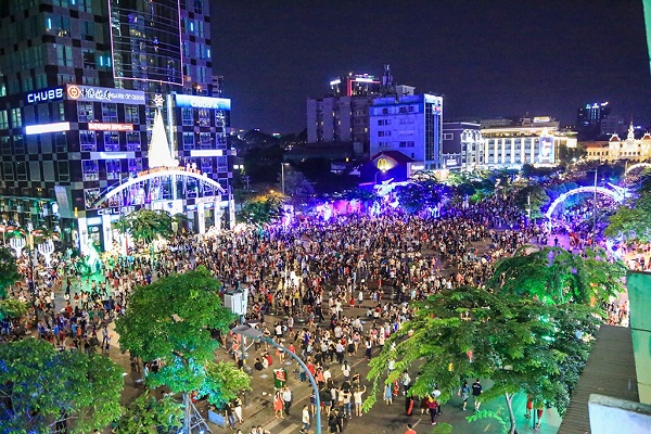 Vào ngày Noel, mọi người thường rủ nhau tới phố đi bộ Nguyễn Huệ để được hòa mình vào không khí Noel ấp áp tràn ngập nơi đây. Gần đến ngày lễ Giáng Sinh, cả khu phố đi bộ được trang trí đầy những cây thông, những ông già Noel và những quả cầu may mắn đầy màu sắc để mọi người đi lại, vui chơi và chụp những tấm hình đẹp. Và còn gì thú vị hơn khi được hòa mình vào âm nhạc, những ca khúc giáng sinh vang lên cùng tiếng trống, tiếng ghita rộn ràng. Một không khí giáng sinh tràn ngập ở địa điểm đi chơi Noel ở thành phố Hồ Chí Minh này. Và còn điều gì thú vị hơn khi được thưởng thức những ca khúc giáng sinh vang lên cùng tiếng ghita, tiếng trống rộn ràng, náo nhiệt. Một không khí giáng sinh ấm áp, vui vẻ tràn ngập ở trên con phố đi bộ này.